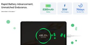 A powerful 8300mAh battery supports 35W fast charging via USB-C port, lasting for long periods of daily use